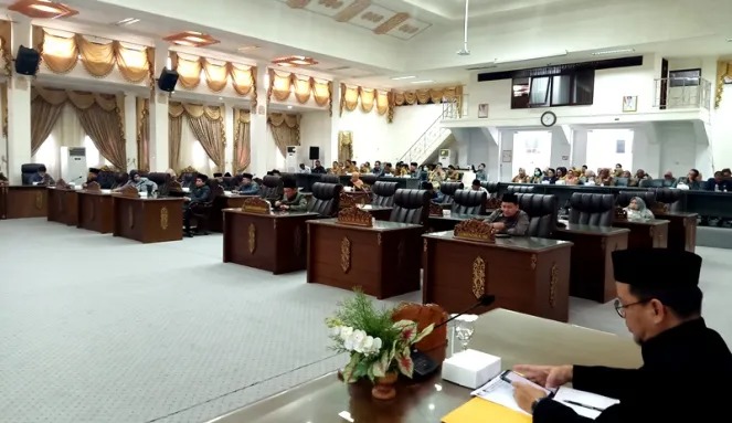 DPRD Barito Utara melaksanakan rapat paripurna III masa sidang II tahun 2023 dengan agenda jawaban pemerintah terhadap pemandangan umum fraksi terhadap raperda tentang penyelenggaraan ketertiban umum dan ketenteraman masyarakat serta pelindungan masyarakat, Selasa 24 Januari 2023. (foto: hms-sb).