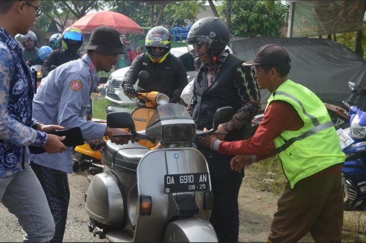 Penjabat Bupati Batola Mujiyat, Naik Vespa hadiri peringatan hari jadi Desa Karang Bunga Kecamatan Mandastana Minggu, (5/3/2023). foto: hms/sb.