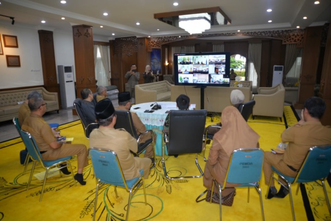 Pj Bupati Batola Mujiyat bersama forkofimda dan jajarannya mengikuti rapat koordinasi dengan mendagri secara daring di rumah jabatan Bupati Batola.  (foto: hms/sb).