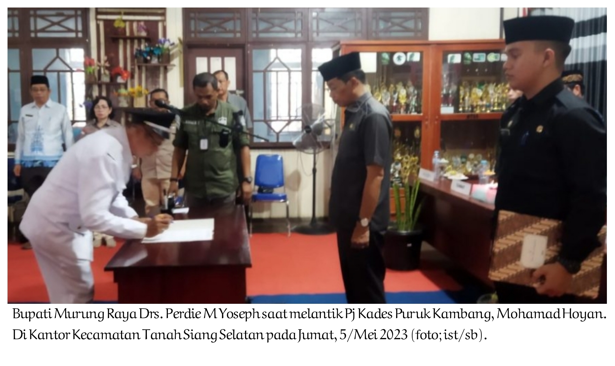 Pada pelantikan Pj kepala desa puruk kambang, Bupati didampingi kepala Dinas PMD Murung Raya, dr. Lynda Kristiane, Kepala Kesbangpol Murung Raya, Mizam Chandrapatih, SE, Camat Tanah Siang Selatan, Andreas, SE. M.Si, hingga sejumlah unsur Tripika Kecamatan dan TNI dan Polri, tokoh masyarakat. (adv/asd-sb).