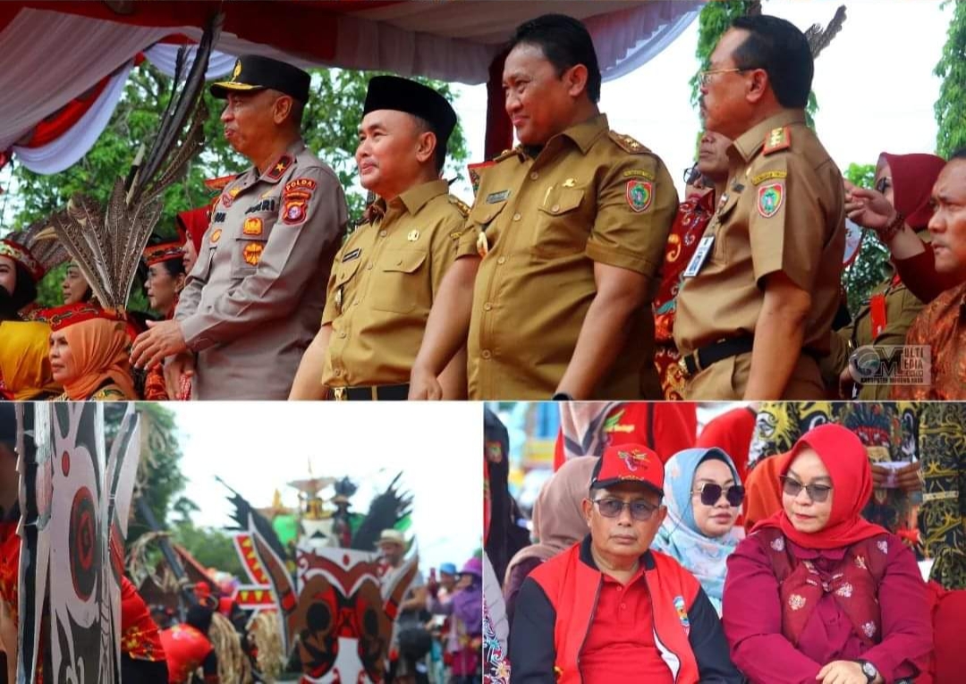 Wakil Gubernur Kalteng H. Edy Pratowo juga secara simbolis mengibarkan bendera start sebagai tanda Karnaval Budaya dimulai dan dihadiri oleh Wakil Bupati Murung Raya, Rejikinnor serta Isterinya. (adv/asd-sb).