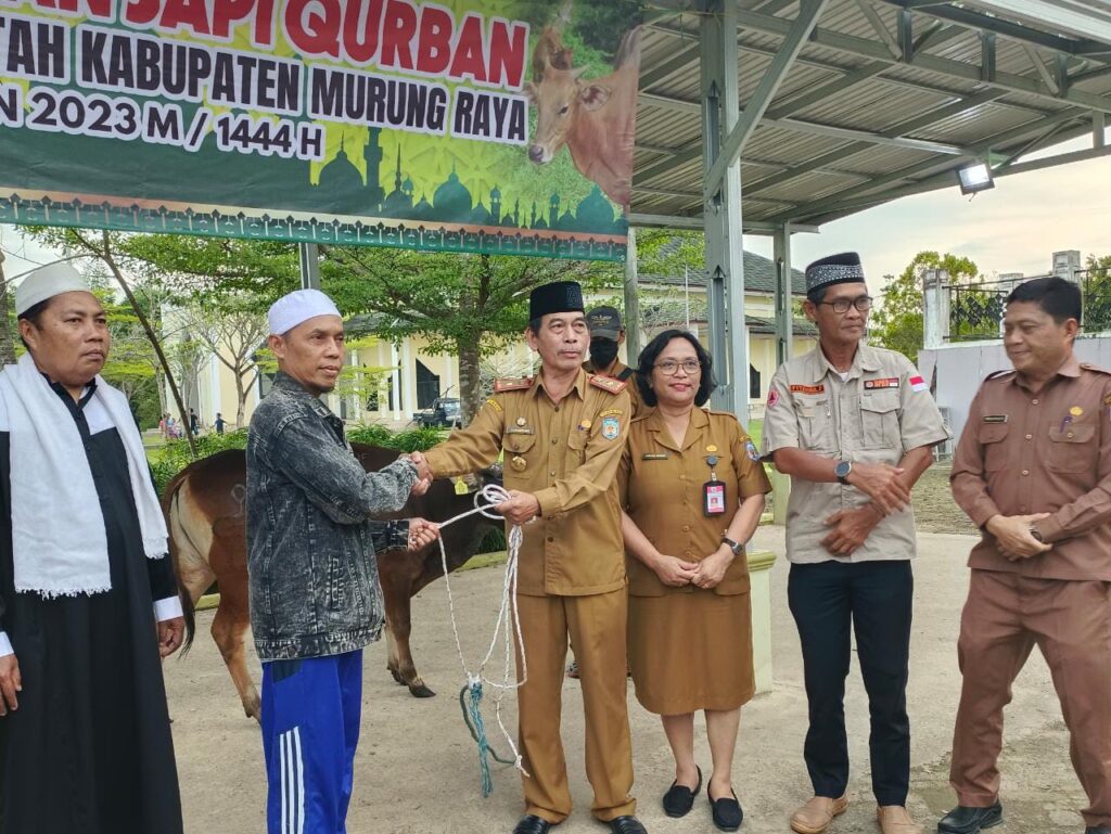 Penyerahan sapi kurban itu secara langsung di serahkan Asisten I Sekretaris Daerah Murung Raya, Serampang kepada masing-masing pengurus Masjid, di halaman Masjid Agung Al Istiglal Kota Puruk Cahu, Selasa (27/6/2023). Dihadiri Kabag Kesra Murung Raya, Endang Yulianti dan Kepala Badan BPBD Murung Raya, Fitrianul Pahriman.