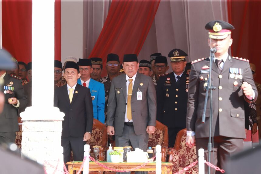 MARABAHAN, sinarbarito.com – Upacara peringatan hari Bhayangkara ke-77 Tahun bertema Polri Presisi Untuk Negeri Untuk Indonesia Maju dilaksanakan di halaman Pemkab Barito Kuala, Sabtu (1/7/2023). Upacara di ikuti oleh pasukan personil Kodim 1005 Barito Kuala, Dinas Perhubungan, Satpol PP, dan seluruh Personil Polres Barito Kuala. Bertindak sebagai Inspektur upacara Kapolres Barito Kuala AKBP Diaz Sasongko yang membacakan sambutan dari Kapolda Kalsel.