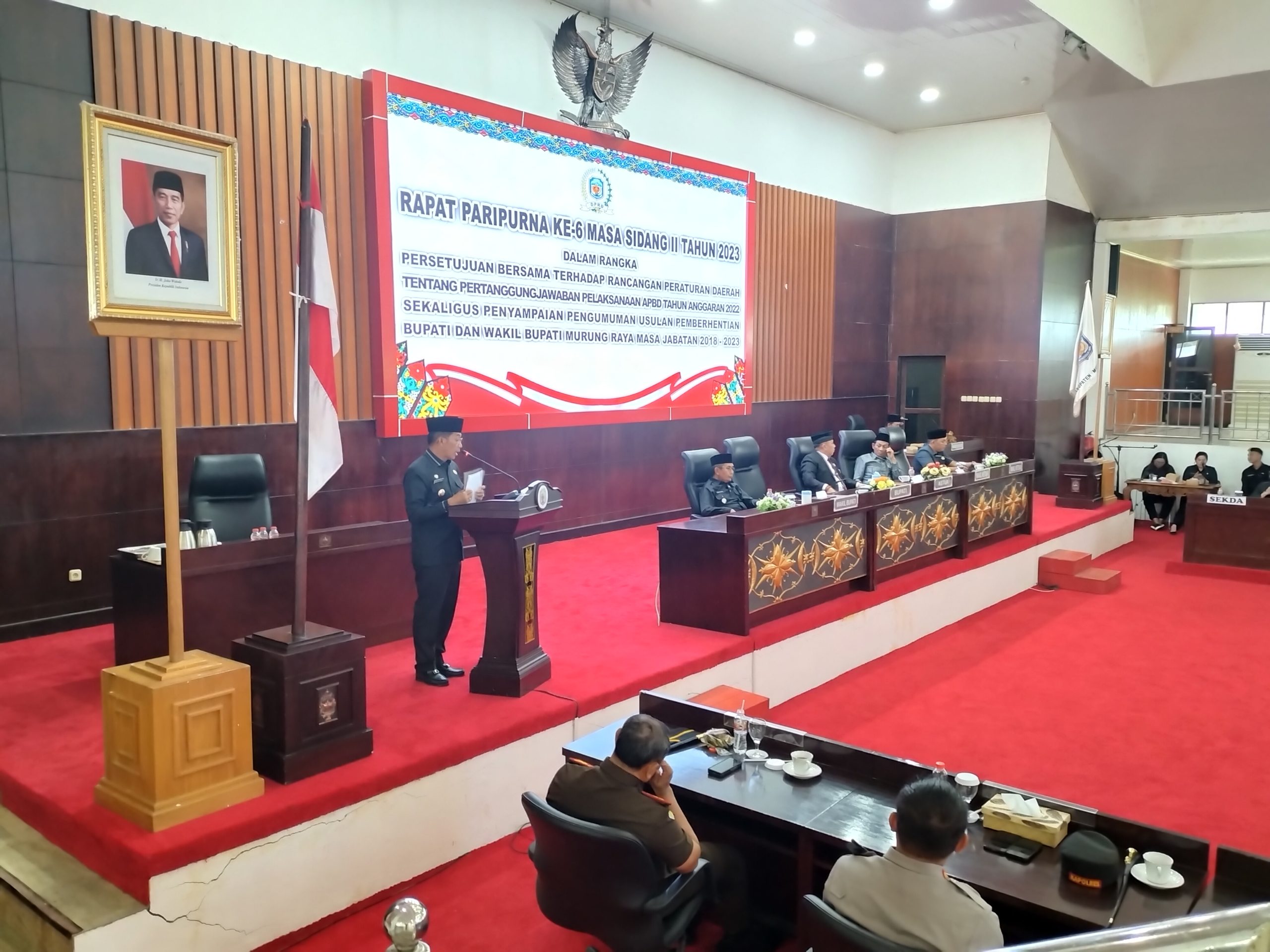 Hal itu diungkapkan ketua DPRD Murung Raya Dr. Doni, SP. M.SI, kepada awak media, Senin (7/8) ketika usai memimpin rapat paripurna ke 6 masa sidang II tahun 2023 dalam rangka persetujuan bersama terhadap rancangan peraturan daerah Murung Raya tentang pertanggung jawaban pelaksanaan anggaran pendapatan daerah tahun 2022 dan sekaligus penyampaian, pengumuman usulan pemberhentian bupati dan wakil bupati Murung Raya masa jabatan periode tahun 2018-2023.Menurut Doni, pengusulan calon Pj bupati Murung Raya ini pihaknya tetap pemberhatikan Undang undangan dan peraturan Menteri Dalam Negeri (Permendagri) nomor 4 tahun 2023 tentang pengusulan nama Pj bupati. Dalam peraturan itu, diberikan kewenangan untuk mengusulkan nama- nama calon Pj, dan juga mendengar semua masukan, saran dari publik.