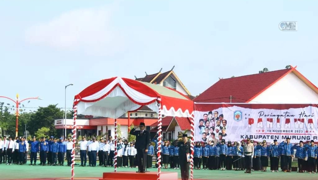 PURUK CAHU, sinarbarito.com Pj. Bupati Murung Raya, Dr. Drs Hermon menjadi Inspektur upacara Bendera Peringatan Hari Pahlawan 2023, di halaman kantor Bupati Murung Raya (Mura), Jumat (10/11/2023).