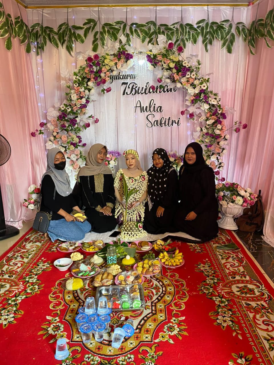 Pasangan dari Jahrani dan liani tersebut Aulia Safitri si hamil yang menggunakan pakaian adat mandi tujuh bulanan dan sambil memangku sebuah tunas kelapa yang diselimuti kain kuning menghadapi sajian 41 macam kue.