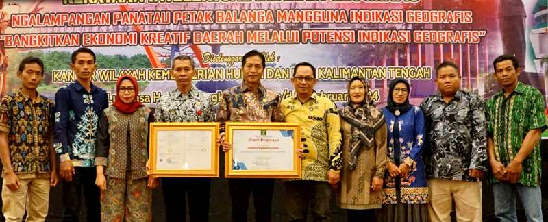 MUARA TEWEH, onlinesinarbarito.com – Pemerintah Kabupaten Barito Utara (Pemkab Barut) menerima sertifikat merk Asosiasi Kelompok Anyaman Rotan Kecamatan Gunung Purei, sekaligus menerima Piagam Penghargaan Atas Partisipasi Dalam Mendorong Pendaftaran Indikasi Geografis dan Program One Village One Brand di Provinsi Kalimantan Tengah, di Ballroom hotel Luwansa Palangkaraya, Kamis (22/2/2024).