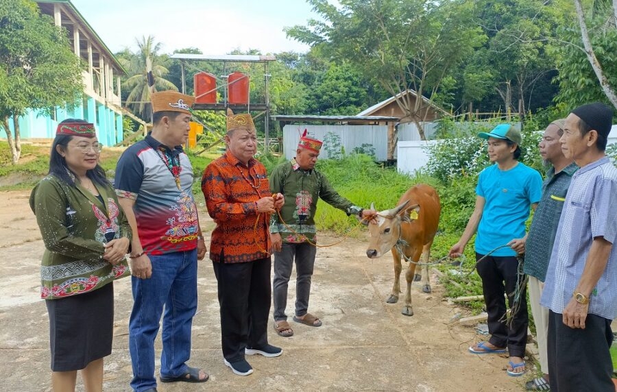 PURUK CAHU, onlinesinarbarito.com – Pengurus Dewan Adat Dayak (DAD) Kabupaten Murung Raya (Mura) menyerahkan secara simbolis bantuan Sapi Kurban dari Ketua Umum (Ketum) DAD Mura Dr Drs Perdie M Yoseph MA (PMY) kepada Ta’Mir Masjid.