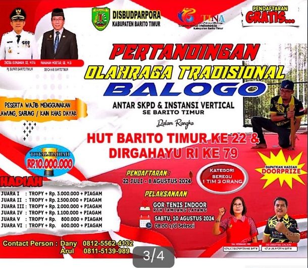 TAMIANG LAYANG, onlinesinarbarito.com – Dalam rangka memperingati Hari Jadi ke-22 Kabupaten Barito Timur dan HUT ke-79 Republik Indonesia, Dinas Kebudayaan Pariwisata Pemuda Olahraga (Disbudparpora) bersama Pelestari Olahraga Tradisional (Portina) Kabupaten Barito Timur akan mengadakan pertandingan Balogo berstandar nasional. Acara ini akan dilaksanakan di GOR Indoor Tenis Ruang Terbuka Hijau (RTH) Nansarunai, Tamiang Layang, Sabtu, (10/8/2024) mendatang.