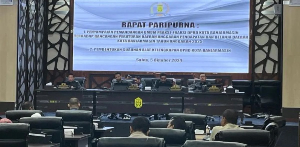 BANJARMASIN, onlinesinarbarito.com – DPRD Kota Banjarmasin, Kalimantan Selatan periode 2024-2029 menyampaikan pemandangan umum rancangan peraturan daerah (Raperda) APBD tahun 2025 yang strukturnya diajukan Rp2,7 triliun. Disampaikan Ketua DPRD Kota Banjarmasin Rikval Fachruri di Banjarmasin, Sabtu, penyampaian pemandangan umum disampaikan seluruh fraksi pada rapat paripurna dewan Sabtu, (5/10/2024).