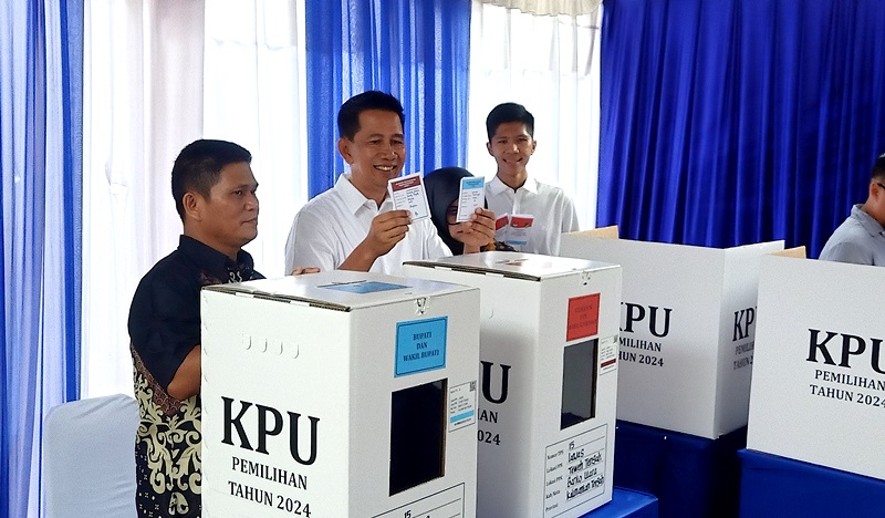 Sementara calon bupati Barito Utara Akhmad Gunadi Nadalsyah menambahkan pada pagi hari ini kami sekeluarga telah memberikan hak suara atau hak pilih di TPS 015 Keluarahan Lanjas Kecamatan Teweh Tengah.