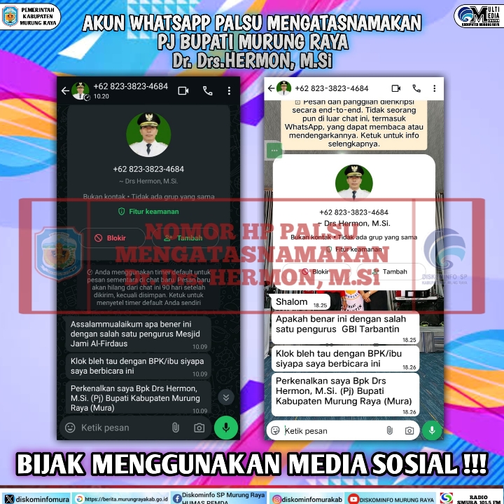 PURUK CAHU, onlinesinarbarito.com – Beredar akun palsu mengatasnamakan Pj Bupati Kabupaten Murung Raya, Dr. Drs Hermon, M.Si melalui akun WhatsApp menggunakan foto profil dan nama Pj Bupati.