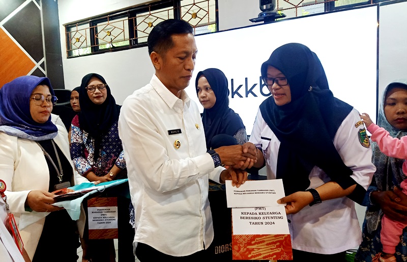 Bantuan PMT diserahkan secara simbolis oleh Pj Bupati Barito Utara, Drs. Muhlis, kepada perwakilan keluarga berisiko stunting. Penyerahan dilakukan kepada dua anak baduta dari Kecamatan Teweh Selatan dan tiga anak dari Kecamatan Teweh Tengah. (adv/sb).