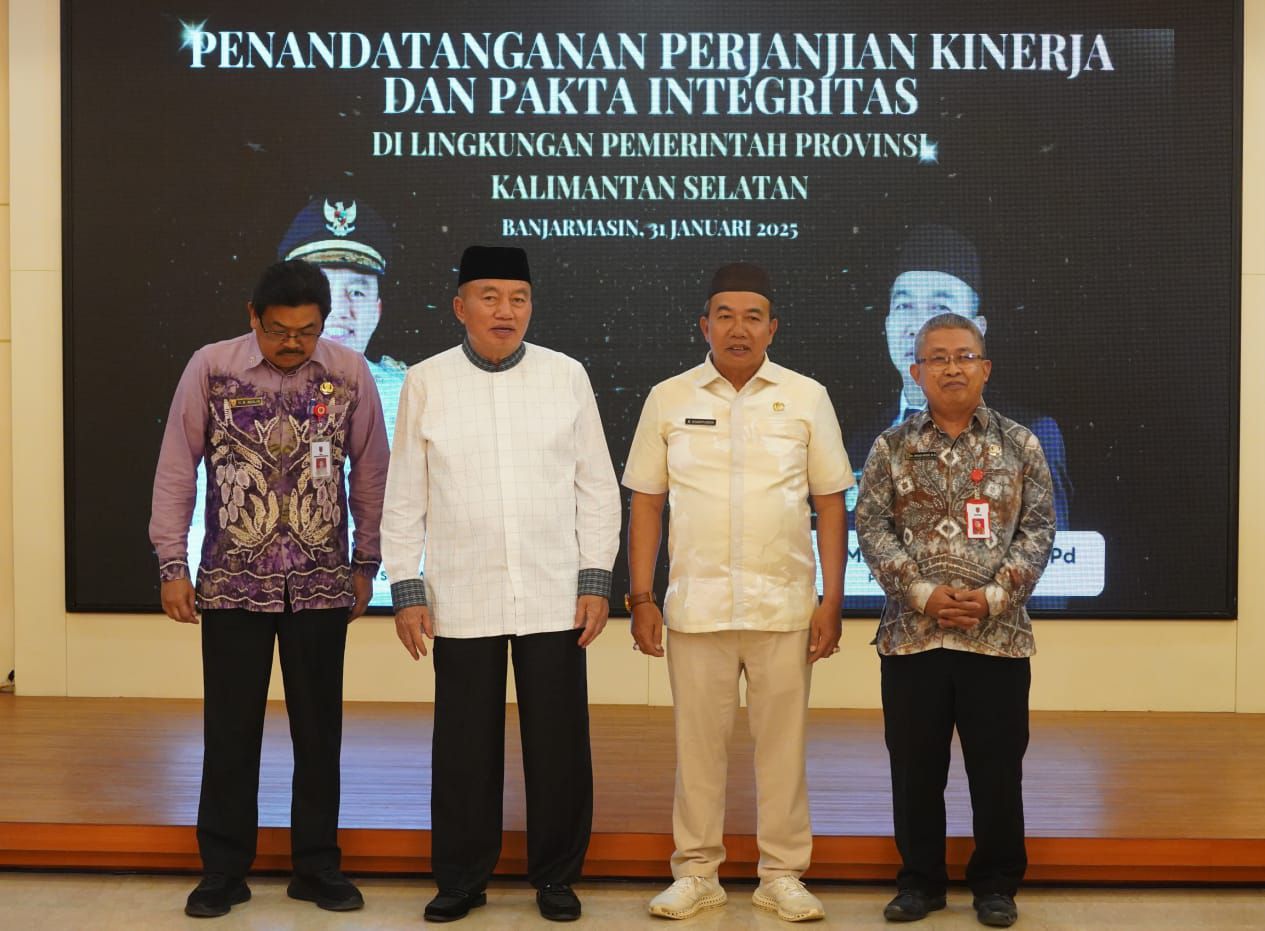 Rakor dirangkai penandatanganan perjanjian kinerja dan pakta integritas oleh Gubernur H Muhidin dilanjutkan Plt Sekdaprov, Kepala Badan Perencanaan Pembangunan Daerah (Bappeda) Kalsel Ariadi Noor, dan Kepala Dinas Komunikasi dan Informatika Kalsel Muhammad Muslim M. Kes secara simbolis.