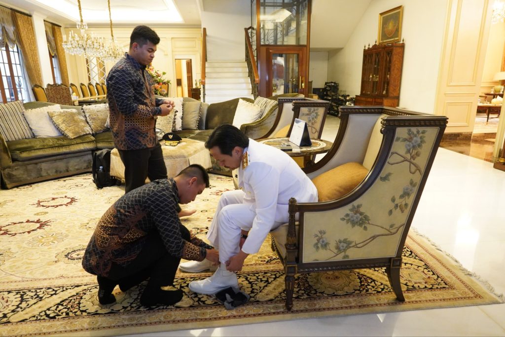 Dibantu para ajudan, satu per satu atribut PDU dipasangkan dengan cermat, mulai dari lencana, tanda kehormatan, hingga pemasangan topi dan sepatu, menambah kesan formalitas dan kesakralan momen pelantikan tersebut.