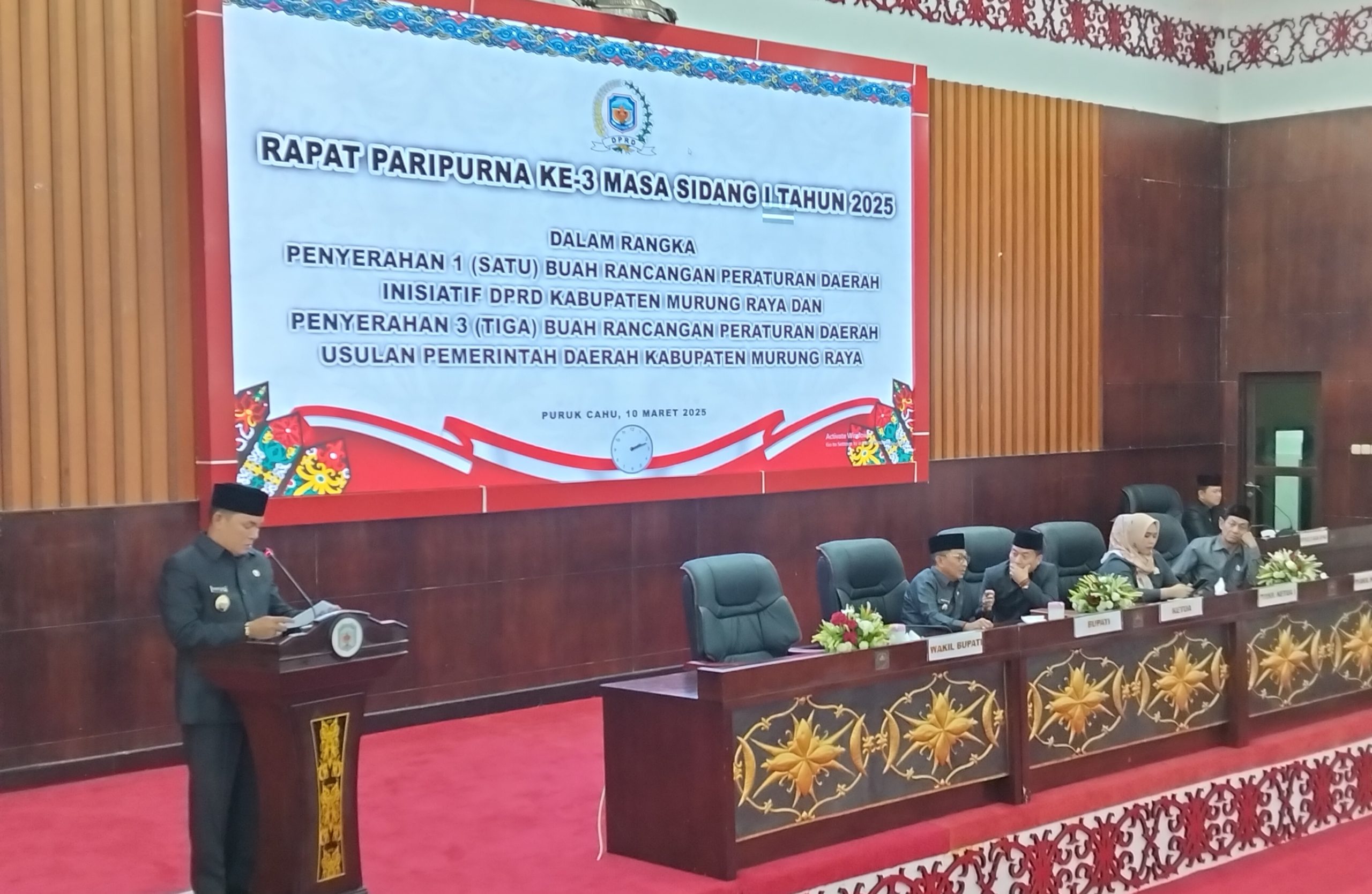 PURUK CAHU, onlinesinarbarito.com – Pemerintah Kabupaten Murung Raya, Kalimantan Tengah, menyerahkan tiga Rancangan Peraturan Daerah (Raperda) ke DPRD pada Rapat Paripurna ke 3 Masa Sidang 1 tahun 2025, di Kantor DPRD, Senin (10/3/2025).