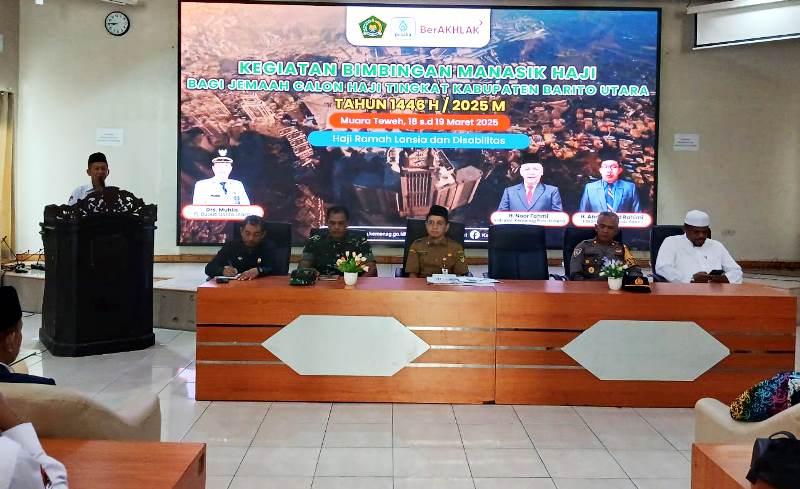 MUARA TEWEH, onlinesinarbarito.com – Kantor Kementerian Agama (Kemenag) Kabupaten Barito Utara menggelar kegiatan Bimbingan Manasik Haji bagi calon jamaah haji tahun 1446 H/2025 M di Aula Gedung Bappeda Litbang Kabupaten Barito Utara pada Selasa (18/3/2025).