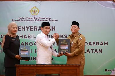 MARABAHAN, onlinesinarbarito.com – Kepala Badan Pemeriksa Keuangan (BPK) RI Perwakilan Kalsel Andriyanto, menyerahkan Laporan Hasil Pemeriksaan (LHP) atas Laporan Keuangan Pemerintah Daerah (LKPD) Kabupaten & Kota Se-Kalimantan Selatan Tahun 2024. Seluruh pemerintah kabupaten dan kota di Kalimantan Selatan meraih opini Wajar Tanpa Pengecualian (WTP) atas Laporan Keuangan Pemerintah Daerah (LKPD) Tahun 2024.