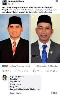 “PSU Jilid II Kabupaten Barito Utara, Provinsi Kalimantan Tengah semakin menarik, karena menyajikan pertarungan dua nama besar dalam sejarah dunia,” tulisnya dalam keterangan foto dua tokoh yang diposting.