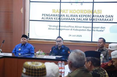 MARABAHAN, onlinesinarbarito.com – Bupati Barito Kuala, H. Bahrul Ilmi menghadiri Rapat Koordinasi Pengawasan Aliran Kepercayaan dan Aliran Keagamaan dalam Masyarakat (PAKEM) yang digelar Kejaksaan Negeri Barito Kuala dengan mengusung tema “Strategis Kondusifitas Aliran Kepercayaan dan Aliran Keagamaan di Kabupaten Barito Kuala”. Kegiatan ini berlangsung di Aula Kejaksaan Negeri Barito Kuala pada Kamis (24/7/2025).