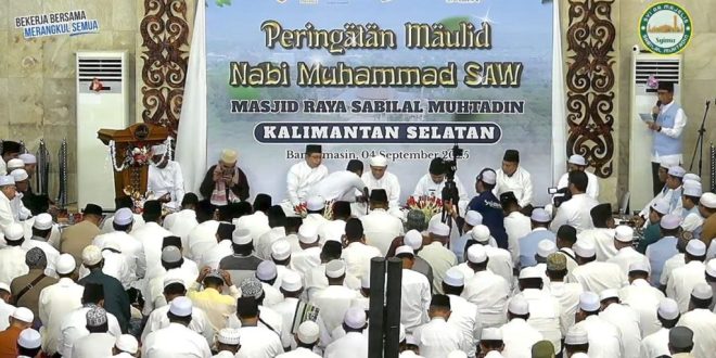 Acara peringatan Maulid Nabi di Masjid Raya Sabilal Muhtadin ini dihadiri jajaran pejabat pemerintah daerah, tokoh agama, habaib, ulama, serta ribuan jamaah yang memenuhi masjid kebanggaan masyarakat Kalsel tersebut. (adv/kmfksl/Ikhsan/sb).