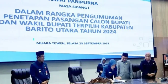 MUARA TEWEH, onlinesinarbarito.com – DPRD Kabupaten Barito Utara secara resmi mengumumkan penetapan pasangan Shalahuddin dan Felix Sonadie Y. Tingan sebagai Bupati dan Wakil Bupati terpilih dalam rapat paripurna yang berlangsung penuh khidmat, Selasa (23/9/2025).