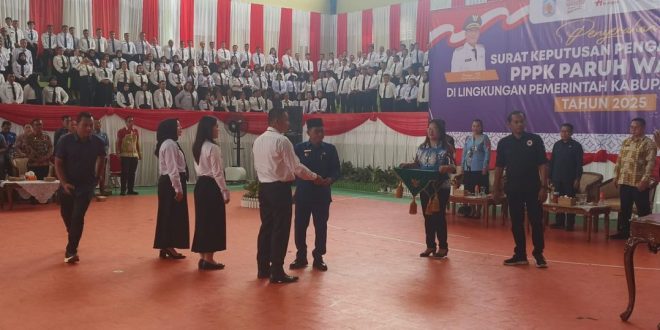PURUK CAHU, onlinesinarbarito.com – Pemerintah Kabupaten (Pemkab) Murung Raya resmi melantik 1.313 Pegawai Pemerintah dengan Perjanjian Kerja (PPPK) Paruh Waktu formasi tahun berjalan. Pelantikan dan penyerahan Surat Keputusan (SK) dilakukan langsung oleh Bupati Murung Raya, Heriyus, di GOR Tana Malai Tolung Lingu, Kamis (6/11/2025).