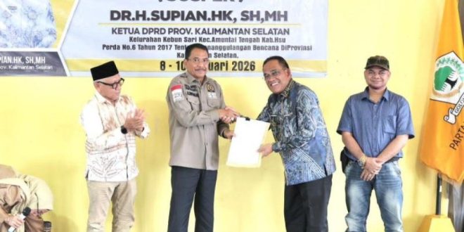 Hulu Sungai Utara KALSEL, onlinesinarbarito.com – Ketua DPRD Kalimantan Selatan (Kalsel) H Supian HK sosialisasikan Peraturan Daerah (Perda) Nomor 6 Tahun 2017 tentang Penanggulangan Bencana di provinsi setempat. (09/01/2026)