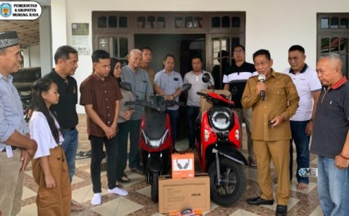 PURUK CAHU, onlinesinarbarito.com – Bupati Murung Raya, Heriyus, menyerahkan bonus kepada atlet dan wasit catur berprestasi berupa dua unit sepeda motor dan satu unit laptop, Senin (12/1/2026). Penyerahan bonus tersebut berlangsung di Kantor Sekretariat DPC Partai Gerindra Kabupaten Murung Raya.