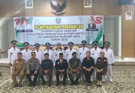 PURUK CAHU, onlinesinarbarito.com – Bupati Kabupaten Murung Raya, Heriyus melaksanakan pelantikan dan pengambilan sumpah jabatan Kepala Desa Pengganti Antar Waktu (PAW), Senin (23/2/2026), di Rumah Jabatan Bupati. Pelantikan ini, turut dihadiri Ketua DPRD Murung Raya, Rumiadi, Penjabat Sekda Murung Raya Sarwo Mintarjo, Kepala Dinas Pemberdayaan Masyarakat dan Desa (PMD), perwakilan Kejaksaan Negeri, Wakapolres Murung Raya, serta para camat.
