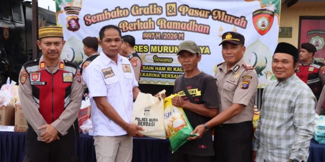 PURUK CAHU, onlinesinarbarito.com – Polres Murung Raya bersama Dewan Pimpinan Wilayah Kalimantan Tengah (DPW) BAIN HAM RI menggelar kegiatan pembagian paket sembako pasar murah di Pospol Bundaran Emas, Puruk Cahu, Rabu (25/2/2026) sore.