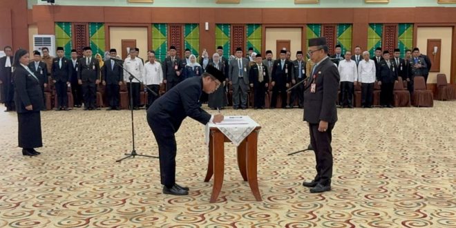 BANJARBARU, onlinesinarbarito.com — Sebanyak 54 kepala sekolah SMA, SMK, dan SLB Negeri di lingkungan Pemerintah Provinsi Kalimantan Selatan resmi dilantik oleh Gubernur Kalimantan Selatan H. Muhidin melalui Sekretaris Daerah Provinsi Kalimantan Selatan M. Syarifuddin di Gedung DR KH Idham Chalid, Banjarbaru, Senin (16/3/2026) pagi.