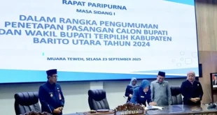MUARA TEWEH, onlinesinarbarito.com – DPRD Kabupaten Barito Utara secara resmi mengumumkan penetapan pasangan Shalahuddin dan Felix Sonadie Y. Tingan sebagai Bupati dan Wakil Bupati terpilih dalam rapat paripurna yang berlangsung penuh khidmat, Selasa (23/9/2025). Rapat ini merupakan langkah final yang diatur dalam peraturan perundang-undangan, sebagai wujud legalitas dan legitimasi hasil …